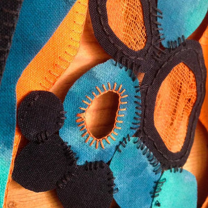Panneaux de coton peints, compresses et fils. Découpes et sutures.